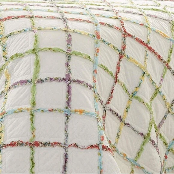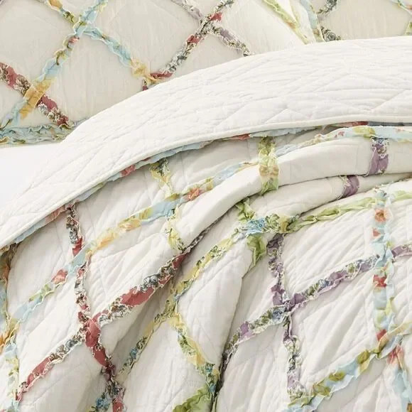 Laura Ashley Oversized Ruffle Garden Quilt ONLY Cotton Soft Reversible BeddingNEW In PackageAdd a fresh touch of farmhouse style to your bedroom with this ruffled garden quilt from Laura Ashley. Multicolored printed appliqued ruffles form a diamond grid across the quilt and bring a touch of summer to any bedroom. Prewashed for softness, this 100% cotton quilt becomes cozier with each wash. Filled with a blend of 80% cotton/20% poly it is light weight yet can be layered for year-round use. quilt and matching shams sold separately.* Made from 100% cotton, a natural fiber that is breathable and eco-friendly* Lightweight yet warm, ideal for year-round use and layering; pre-washed for extra softness* Filled with a blend of 80% cotton 20% polyester for warmth and durability* Quilt and coordinating standard shams sold separately* King set: quilt 96 L x 104 W* Included shams have a back envelope closure* Cotton is biodegradable and requires less energy to process than other fibers* Machine washable for easy care* Creamy ivory ground criss-crossed by red, blue, green, yellow and purple printed ruffles, reverses to solid ivory* Coordinates perfectly with laura ashley sheets, sold separately